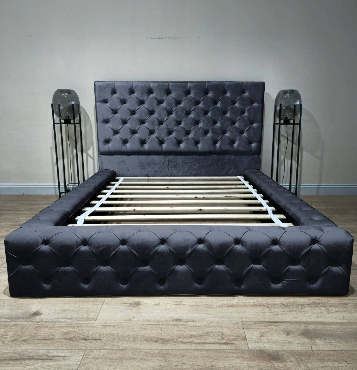 We are delighted to offer our bose with a chesterfield matching headboard and tufted upholstered side rails and footboard. This is a truly stunning quality bed. Single, double , king, super king all sizes available please do get in touch with further questions.