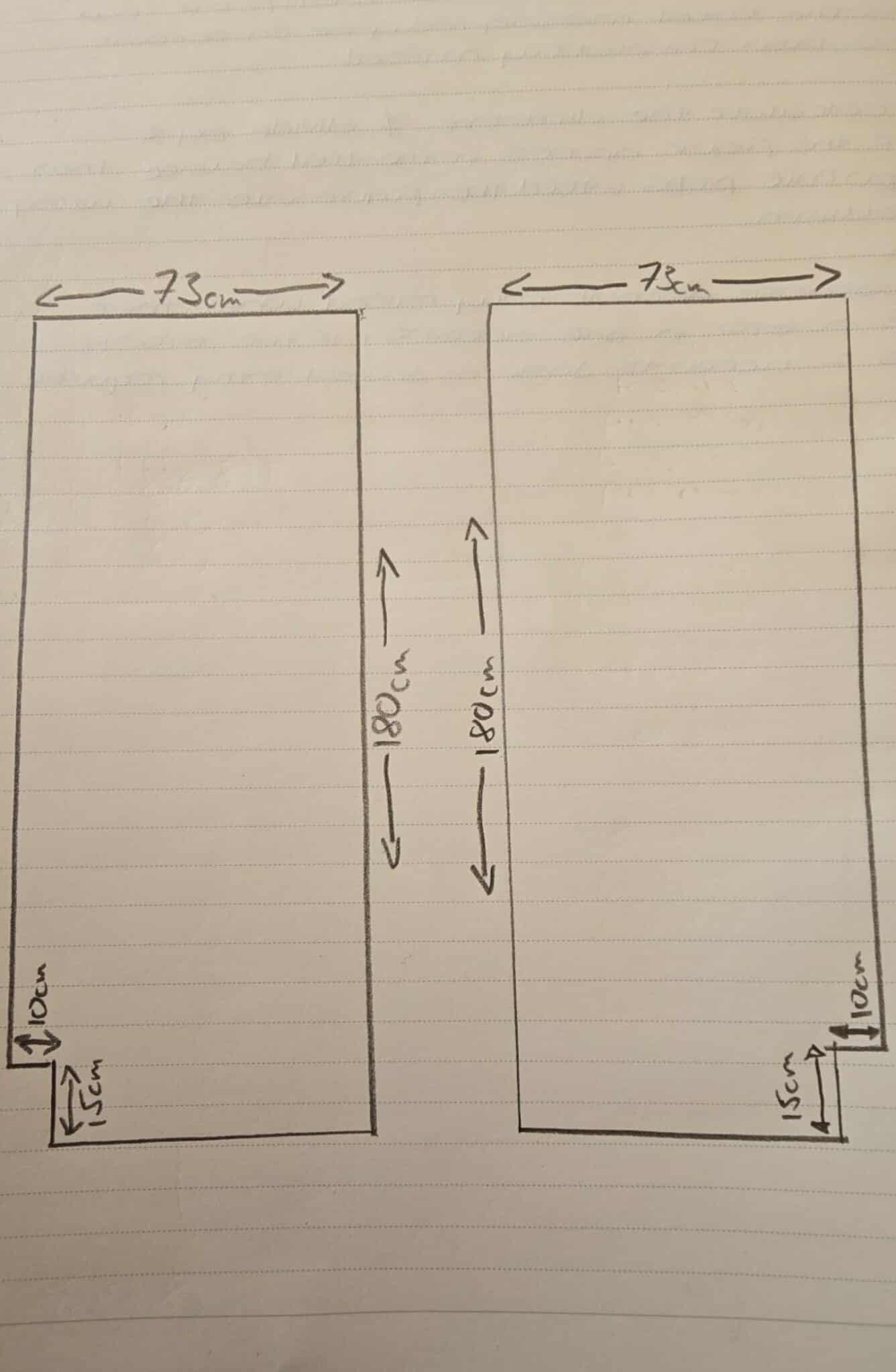 width 73cm with a corner cut out 10cm × 15 cm